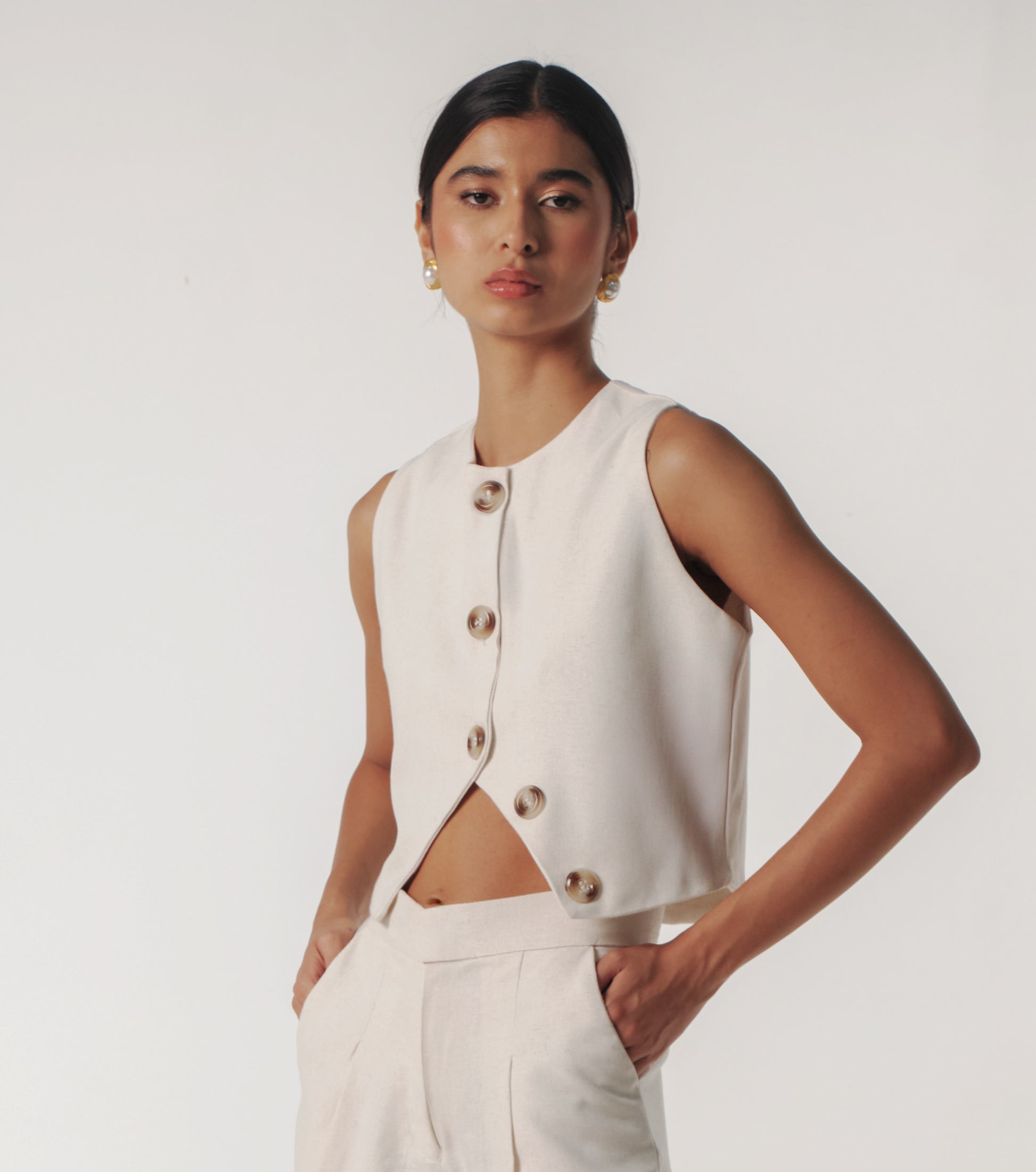 Como si hubiera nacido del armario de un viajero del Caribe, el Top Habitante es un chaleco sin mangas de silueta oversize que respira libertad. Su corte amplio y ligero se mueve con el viento, dejando que el cuerpo encuentre su propio ritmo.