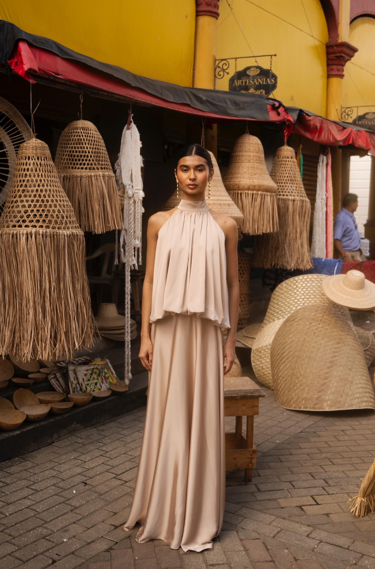 Un vestido largo en seda color arena oscura, pensado para caer con suavidad sobre el cuerpo.